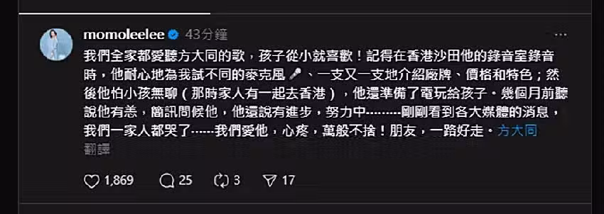 沒想到,如今傳來方大同死訊,陶晶瑩、李李仁一家都落淚,「我們愛他,心疼,萬般不舍!朋友,一路好走」。