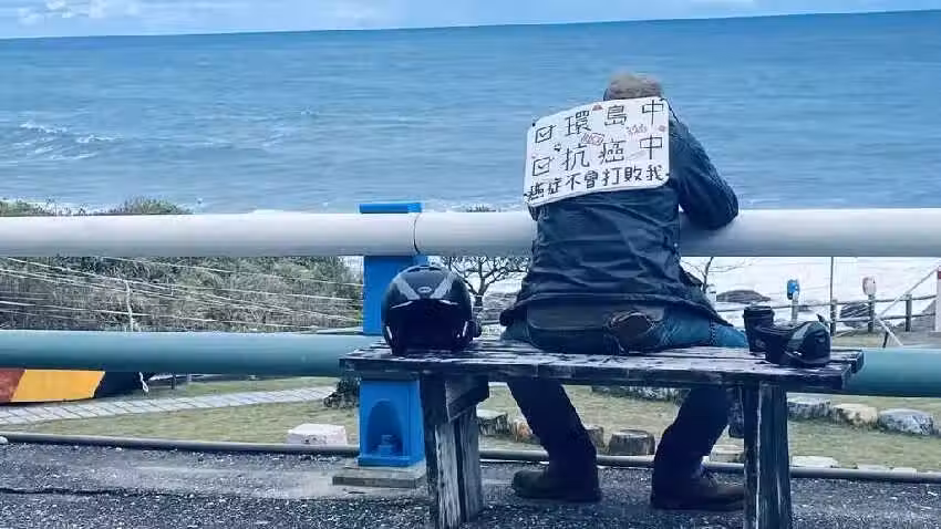 原PO在臉書粉專《騎車環島趣》上傳一張照片,這張照片是在花蓮的親不知子天空步道拍攝的,只見一名男子坐在長椅上靜靜看海,他身旁放著安全帽、腰包和一杯咖啡,背上的瓦楞板上則寫著「環島中」、「抗癌中」、「癌症不會打敗我」等字句