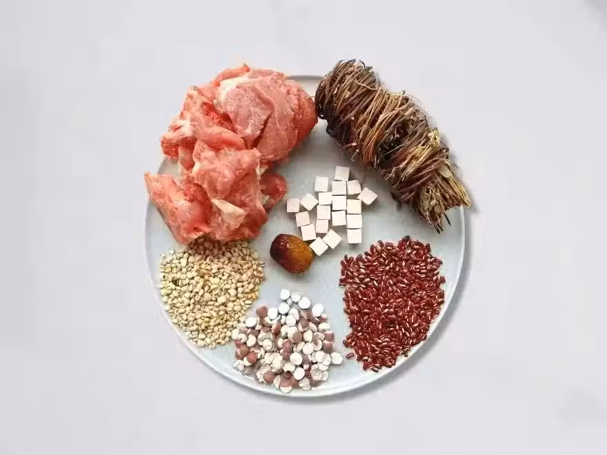 雞骨草30克、靈芝片10克、土茯苓20克、赤小豆15克、薏米15克、蜜棗2顆、豬骨400克、鹽適量、薑片適量