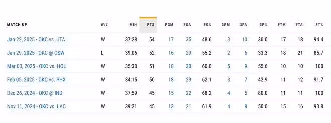 在今日(2025年3月4日)雷霆vs火箭的比賽中,亞歷山大再次砍下50+,此戰他30中18(三分9中5),10罰10中,砍下了51分5板7助攻,帶領雷霆以9分優勢擊敗火箭。