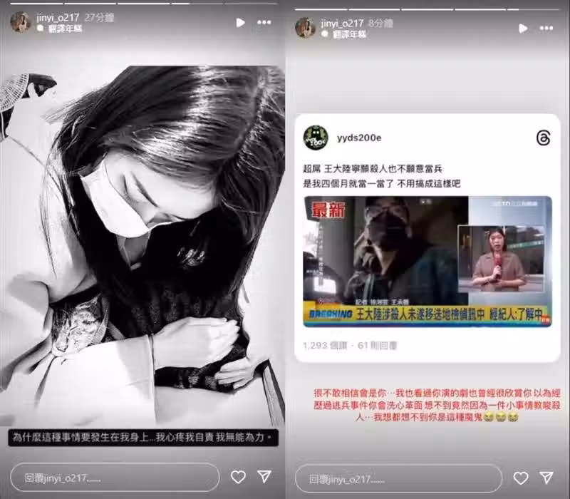 她還po戴口罩自拍照(不確定是否為本人)說:「為什麼這種事情要發生在我身上…我心疼我自責 我無能為力」。最後隔空怒斥王大陸:「很不敢相信是你…我也看過你演的劇也曾經很欣賞你 以為經歷過逃兵事件你會洗心革面 想不到竟然因為一件小事情教唆殺人…我想都想不到你是這種魔鬼(哭)(哭)(哭)」。