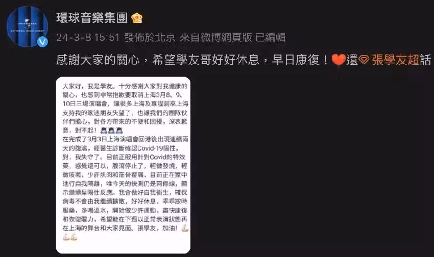 對此,官方提到,張學友會做好自我衛生,確保病毒不會繼續擴散,並好好休息、按時服藥、多喝溫水,並開始做少許運動,希望能儘快康復和恢復體力,下周就能以健康的狀態在上海和粉絲見面。