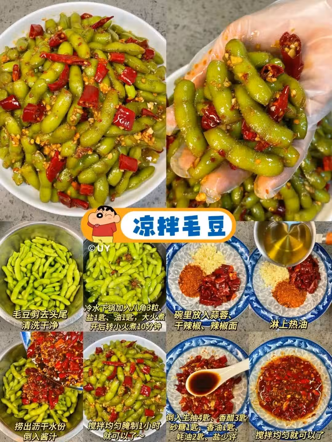 毛豆、蒜片、辣椒麵、醋、八角 干辣椒