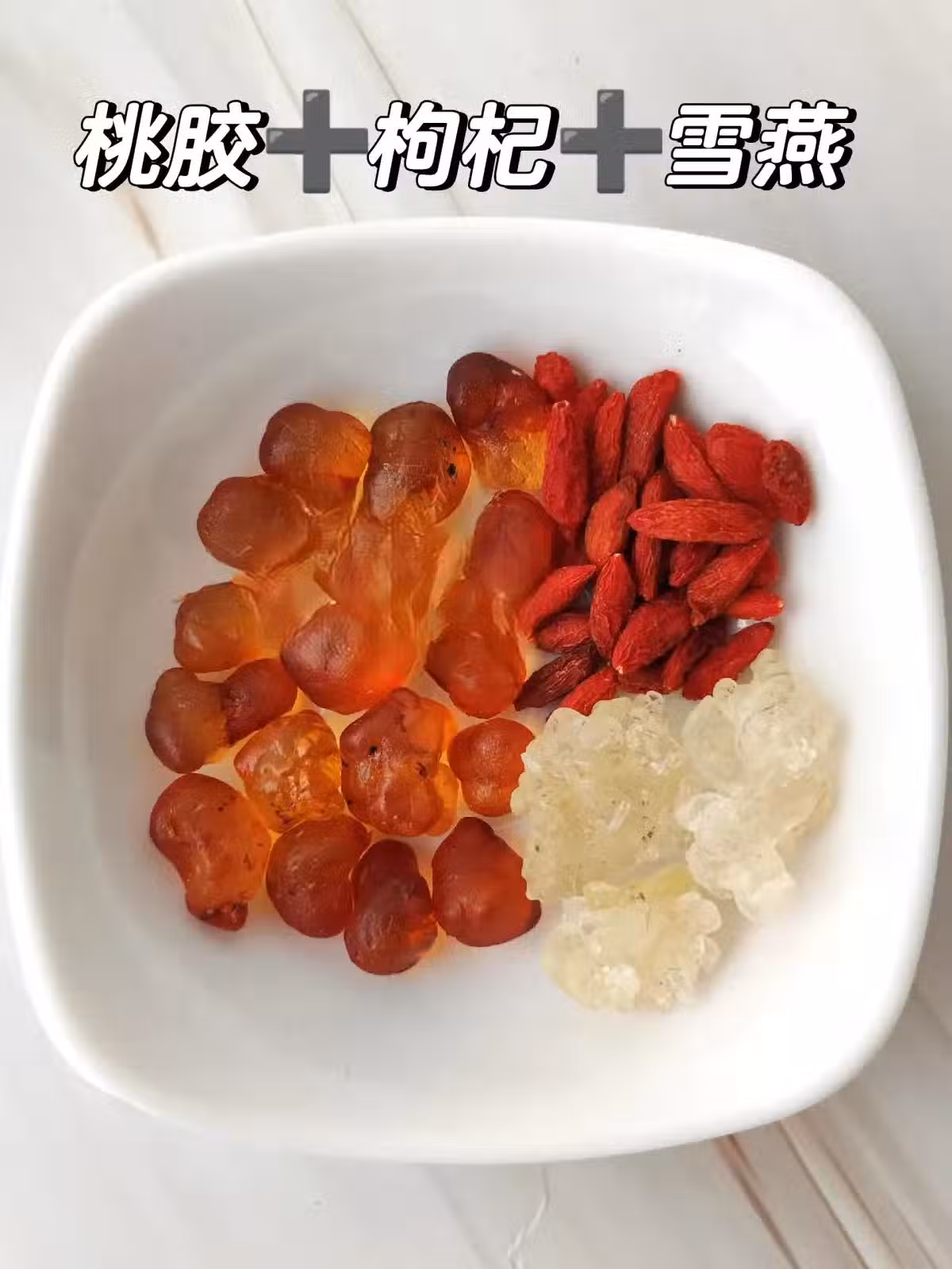 》桃膠雪燕提前浸泡1晚上,其他食材清洗乾淨,養生壺加適量清水煮30分鐘,可加點冰糖調味