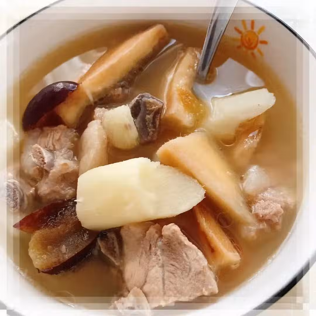 葛根2到3片,山藥半根,排骨半斤,一小把枸杞,隨便幾個紅棗。