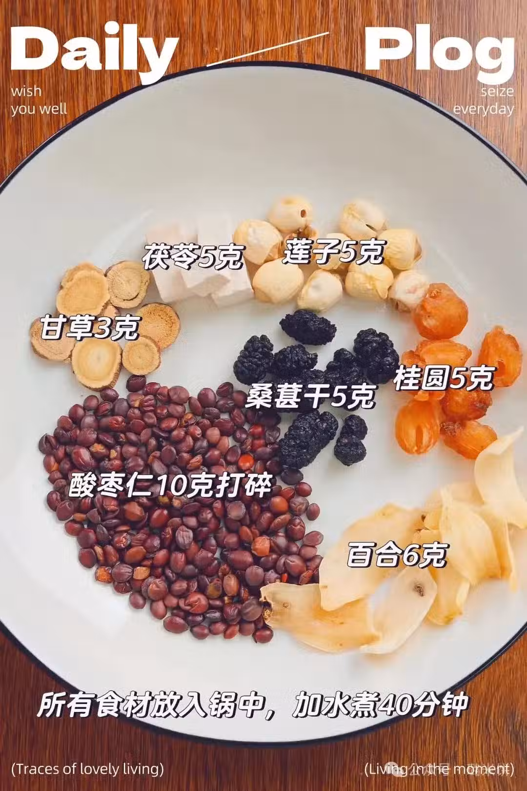 酸棗仁10克(記得打碎)、桂圓5克、蓮子5克、百合6克、甘草3克、桑葚5克、茯苓5克,