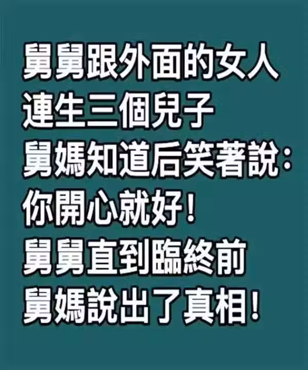 舅舅跟外面的女人連生三個兒子,舅媽知道後笑著說:你開心就好!舅舅直到臨終前,舅媽說出了真相