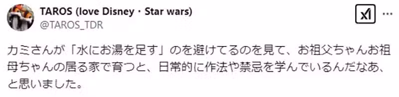 其中有一位暱稱「TAROS」的網友,就認為這跟從小家裡有沒有祖父母之類的長輩有著很大的關係,最好的例子就是他的老婆。因為他的老婆總會避免「將熱水加進冷水裡」,而他認為老婆就是從祖父母身上學來這種禁忌的。