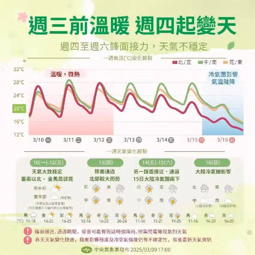 根據《TVBS新聞網》報導,未來一周天氣將上演大反轉,民眾要好好把握10日至12日的好天氣,因為周四開始將有兩波鋒面接力報到,加上冷氣團南下,天氣狀況將有重大變化。