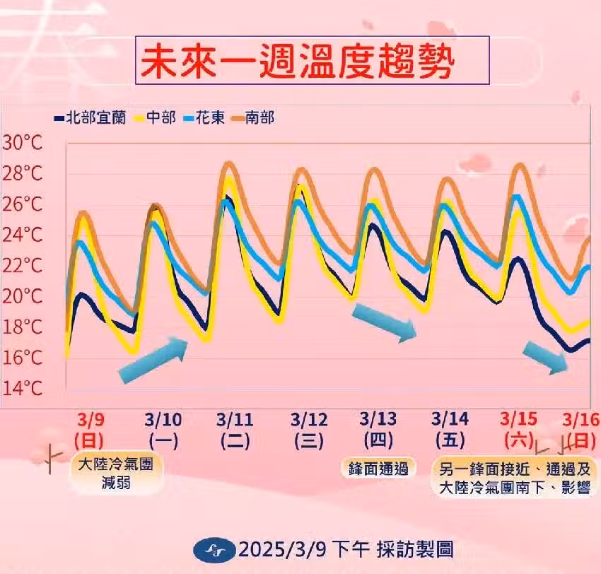 到了周六,鋒面通過時除了要提防雷雨,還將伴隨大陸冷氣團南下,北部及東北部氣溫將明顯下降。