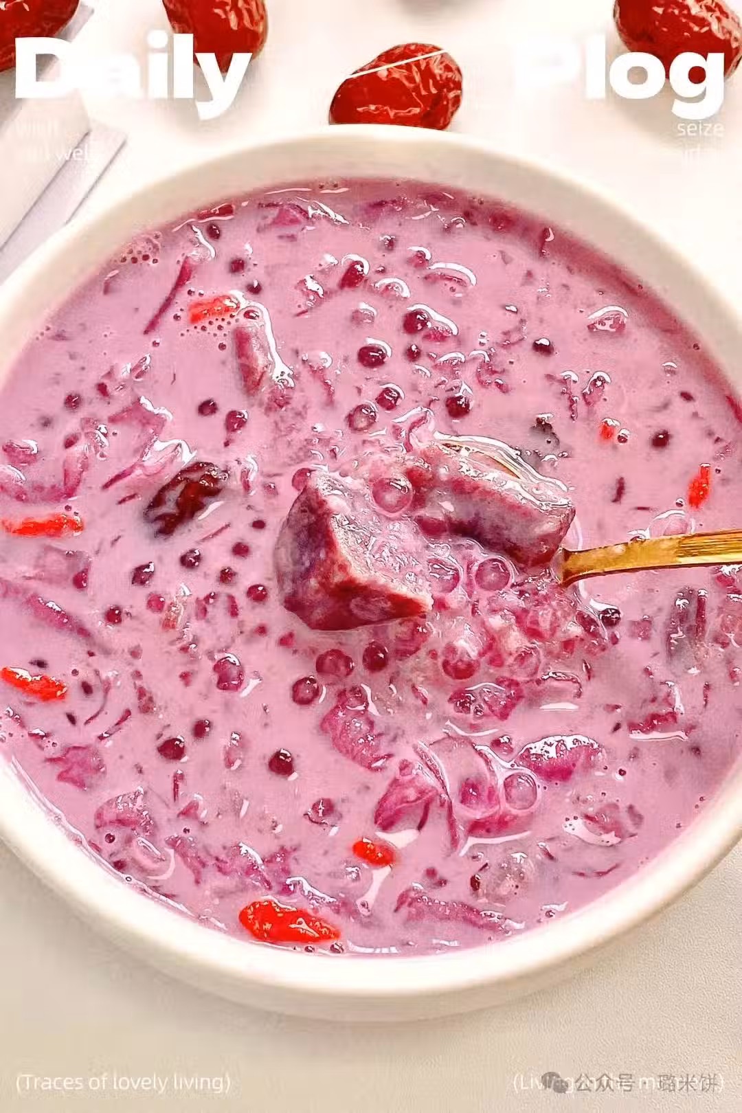 跟她聊天套話,說一直很注重抗氧化,花青素抗氧化不錯,紫薯就含了不少,銀耳滿滿膠質感,枸杞、紅棗、百合,都是對女生好的食材。