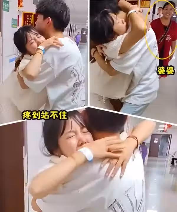 她緊緊抱住自己的丈夫,希望通過他的支持和安慰來緩解疼痛。