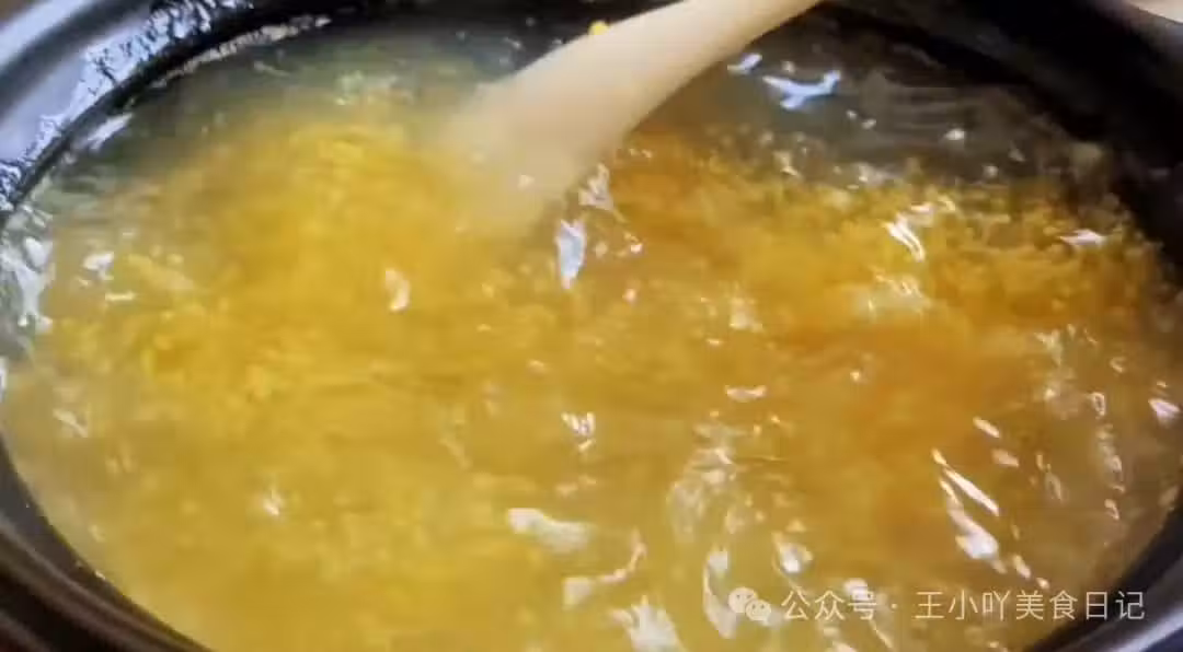 小米下鍋後,持續攪動約一分鐘,然後將茯苓全部加入鍋中。轉成最小火,燉煮30分鐘左右。茯苓不易煮熟,因此需要多煮一會兒。