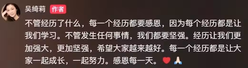 為此事,吳綺莉還特意發了一段文章告訴大家,這一切的經歷要感恩每一天。