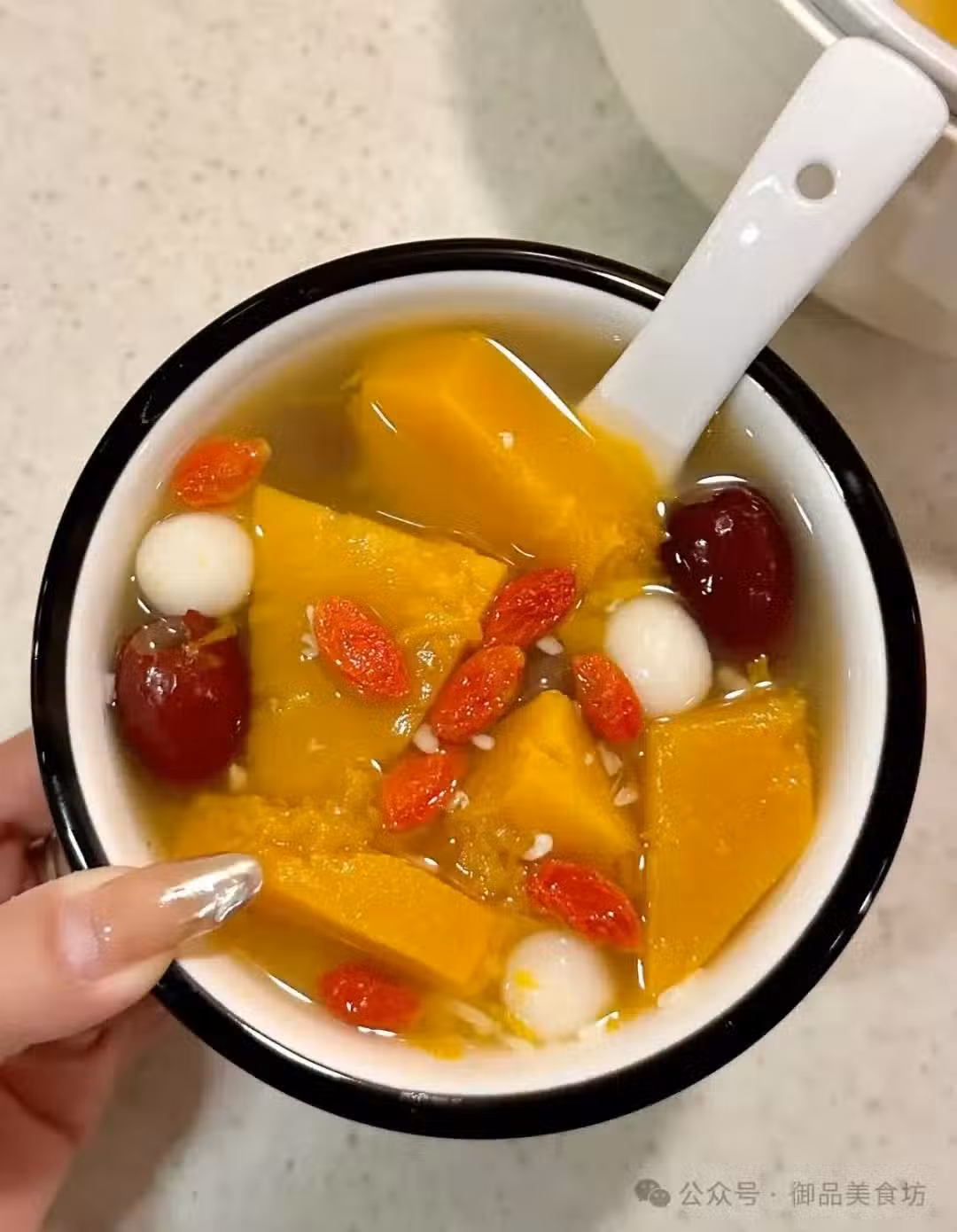 食材:南瓜、酒釀、小圓子、紅棗、桂圓、枸杞。