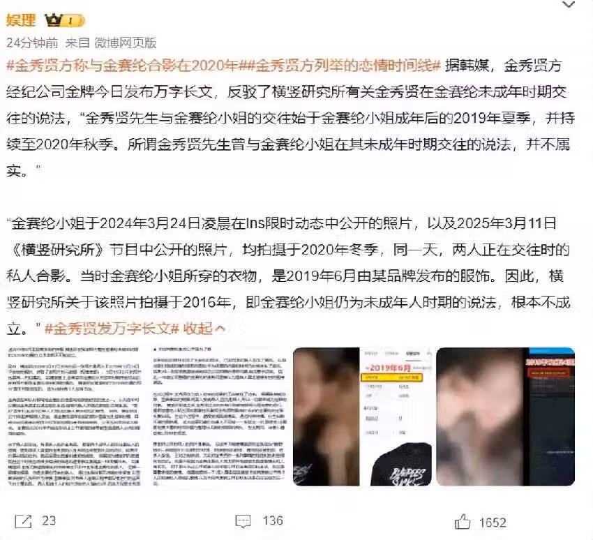 經紀公司發布萬字長文強調,將以反駁「橫豎研究所」報道內容為根據,於下周發布正式文章,之所以會提前承認與金賽綸交往,是金秀賢14日凌晨心理急劇不穩定,為的是讓金秀賢保持絕對穩定,還說金秀賢因為「橫豎研究所」爆料金賽綸死亡原因,讓金秀賢陷入了嚴重的混亂,從12日晚上到13日中午,有攝影機對著公司門口和停車場不停錄像,對金秀賢的心理壓力持續不斷。