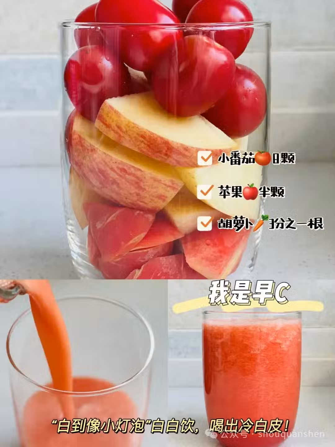番茄富含番茄紅素,能夠保護肌膚免受紫外線傷害,胡蘿蔔中的β-胡蘿蔔素幫助保持皮膚健康。這款果蔬汁能幫助排出體內的毒素,去除暗沉,改善膚色,讓你喝出「冷白皮」,還原肌膚的自然光澤。