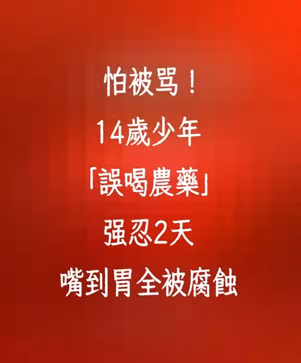 一名14歲少年誤喝農藥,儘管非常不舒服,但他因為怕被爸媽罵而決定隱瞞,2天後他情況嚴重被送醫搶救……