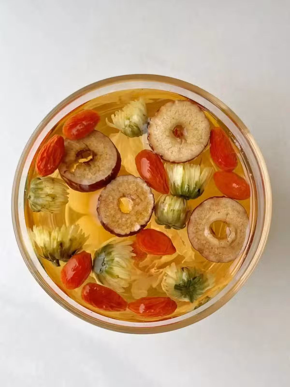 食材:胎菊2g+紅棗3顆+枸杞2g+玫瑰3g+桂圓5g
