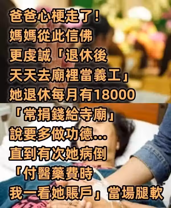 母親之前在農業園上班,退休後一個月的退休金有18000左右,但是她的生活卻過得比那些沒有退休金的老人苦多了,因為她把大部分的錢都捐給了附近的寺廟。