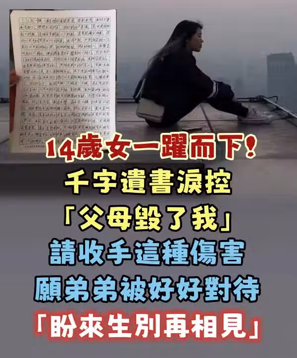 14歲女一躍而下 千字遺書淚控「父母毀了我」請收手這種傷害 願弟弟被好好對待「盼來生別再相見」