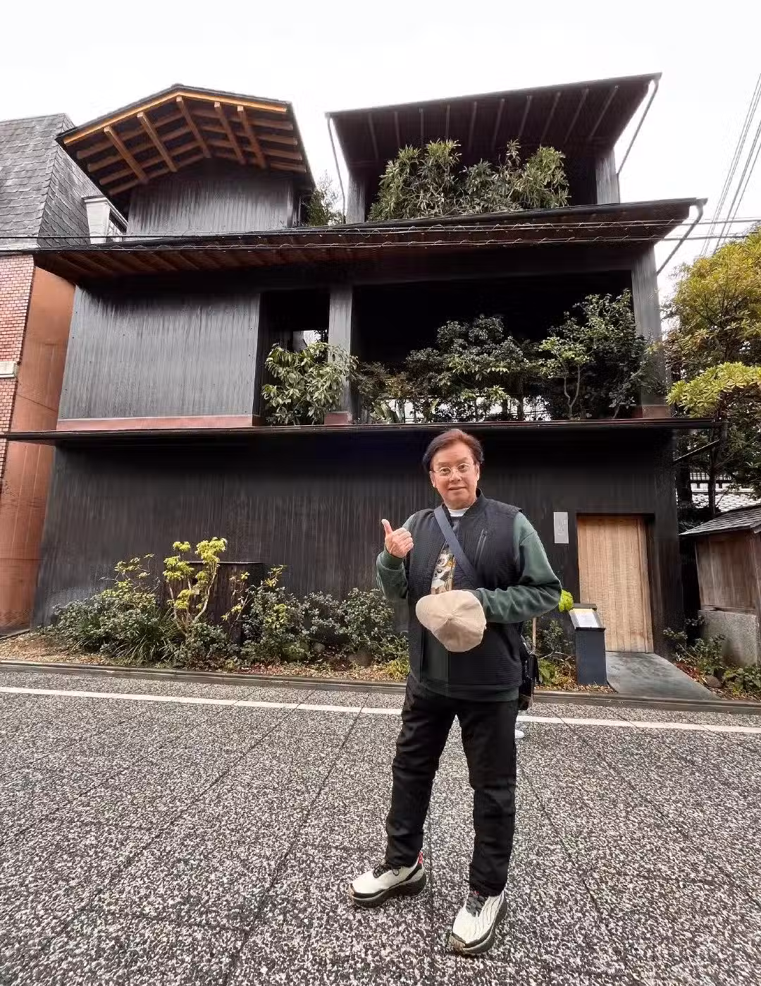 74歲譚詠麟去日本,在雨中散步,吃豪華蟹宴,對當地建築讚不絕口