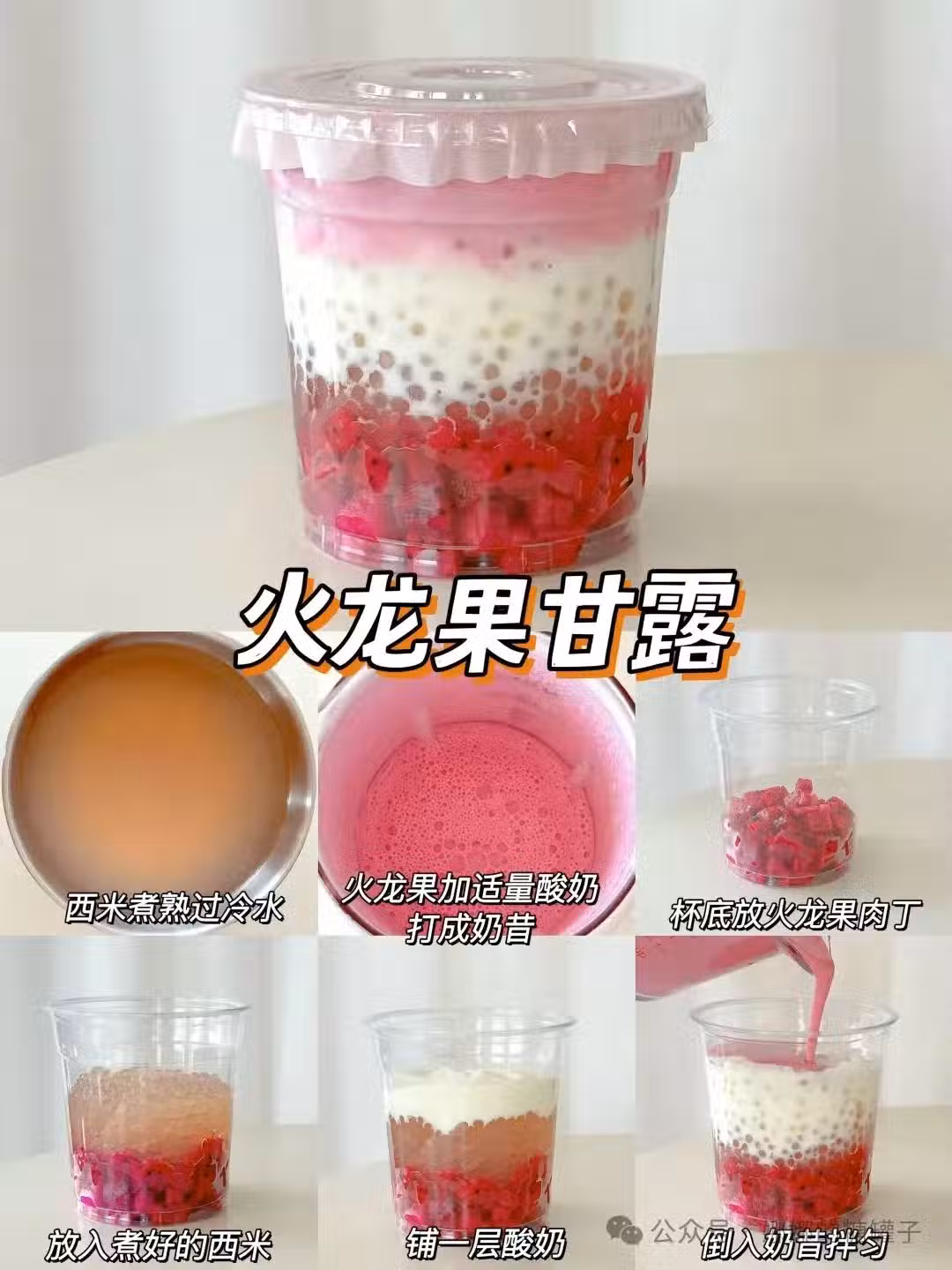 做法:1.西米煮熟過冷水。2.熟芋頭、紫薯加適量奶壓成泥。3.杯底放芋泥。4.掛一下壁。5.放入煮好的西米。6.鋪一層酸奶拌勻。