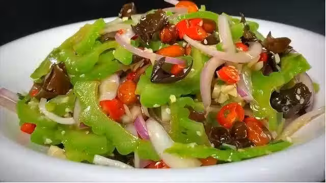 用筷子充分攪拌均勻,將調好的料汁淋到苦瓜上,充分抓拌均勻,讓食材充分入味。一道美味的涼拌苦瓜就完成了。