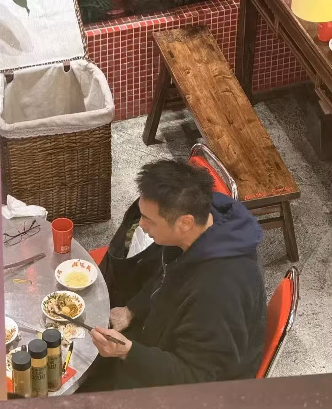 他沒有戴口罩,一開始他還戴著眼鏡,後面吃到起興了,他乾脆把眼鏡也摘掉了!