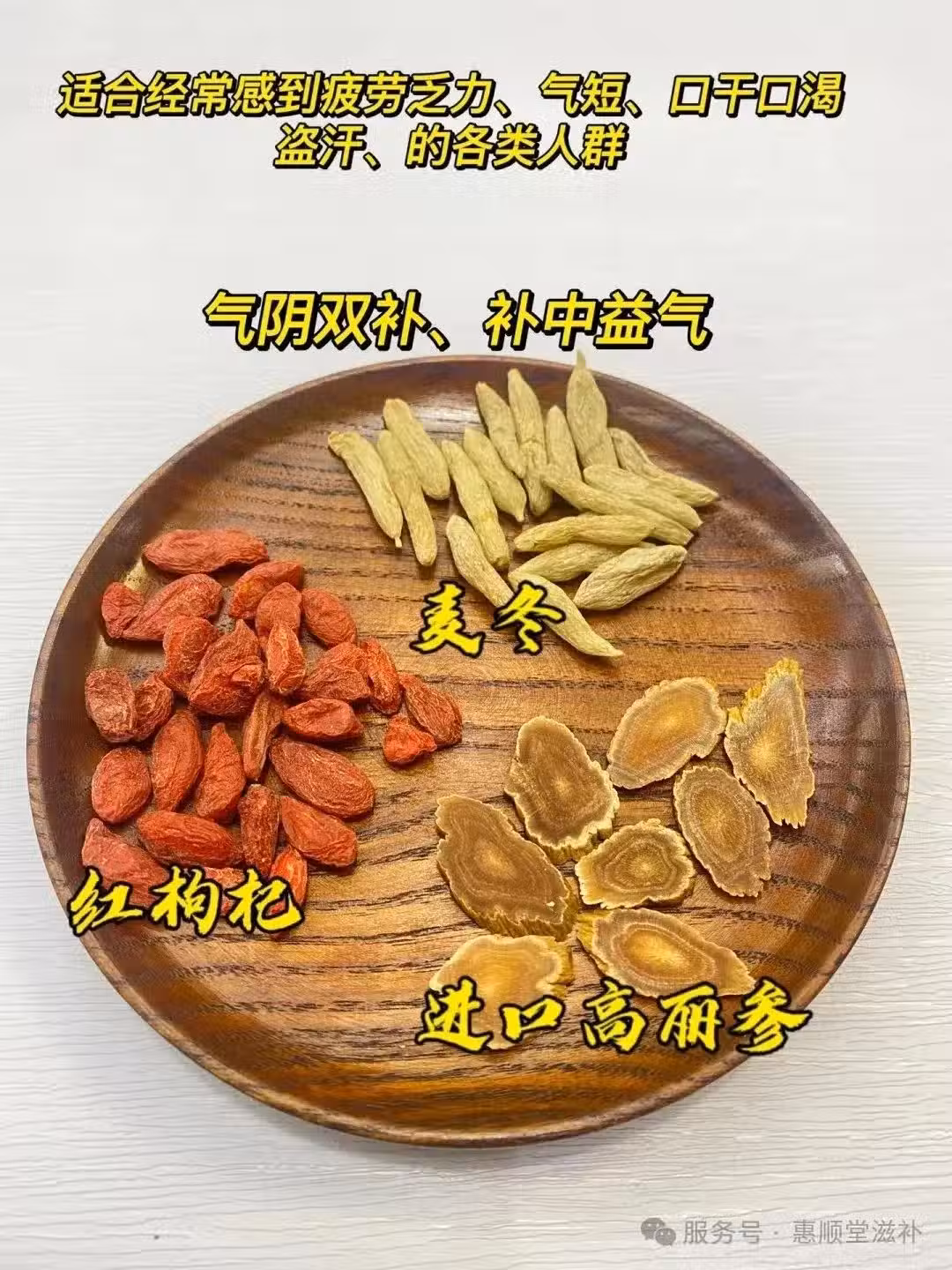①高麗參➕麥冬➕紅枸杞:氣陰雙補、補中益氣