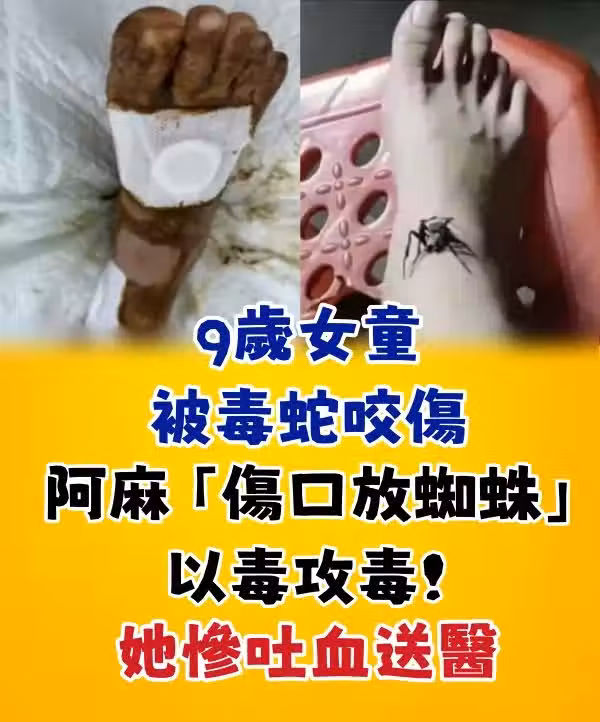 中國一名9歲女童被毒蛇咬傷,但女童的阿嬤卻沒有馬上帶她帶醫院救治,反而聽信偏方想以毒攻毒,抓了蜘蛛放在女童傷口上吸毒,結果導致女童吐血送醫。