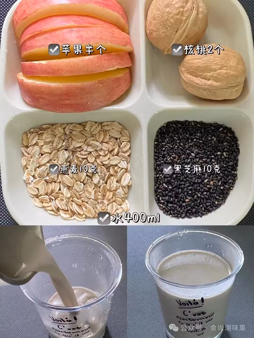 最後是蘋果燕麥豆漿,半個蘋果、10g燕麥、10g黑芝麻、2顆核桃。燕麥富含膳食纖維,黑芝麻和核桃又能滋養肝腎,這款豆漿不僅營養豐富,還能幫你輕鬆開啟活力滿滿的一天,減脂期的姐妹也能放心喝。