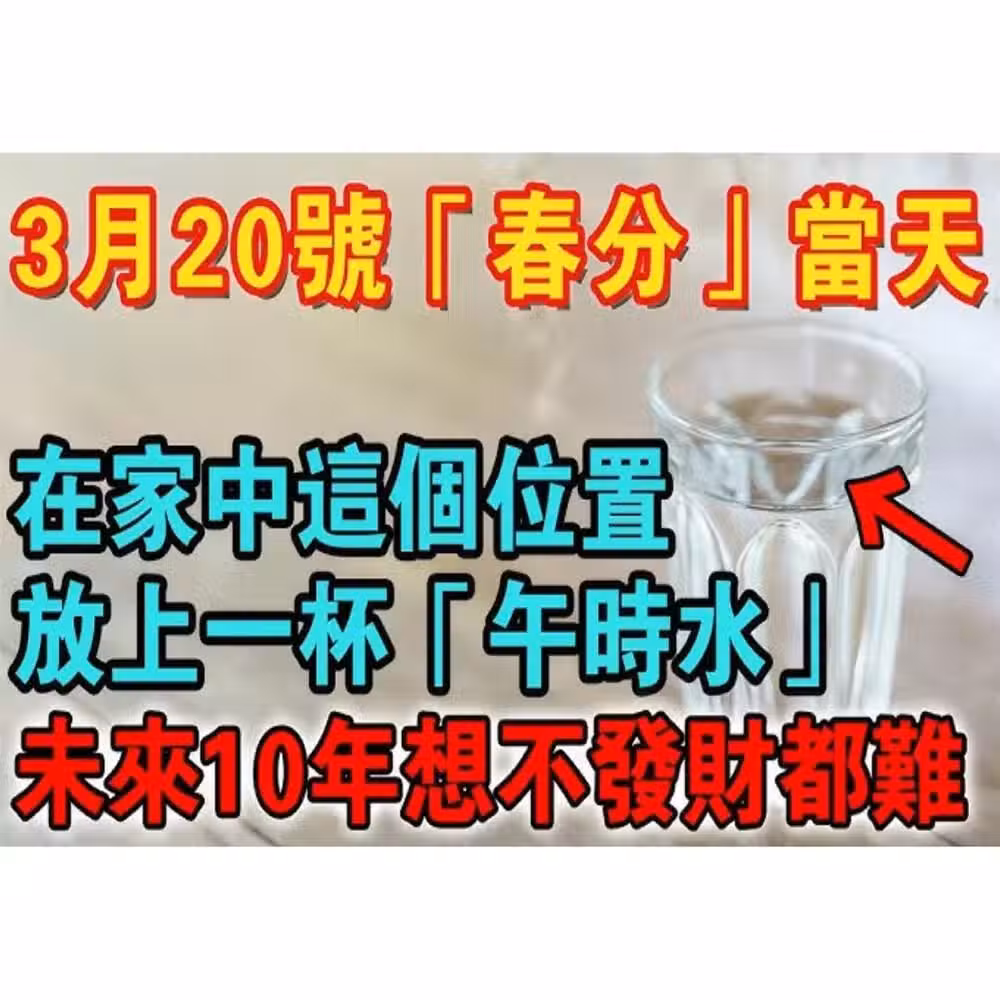 2025年3月20日是**「春分」,這一天是二十四節氣之一,象徵著陰陽平衡、萬物復甦、氣運轉變!如果能夠在「春分」這一天掌握好開運技巧,未來十年運勢將一路高升,財源滾滾!特別是「午時水」**,更是古人流傳已久的催財秘法,只要放對地方,財運、貴人、好運接踵而至!