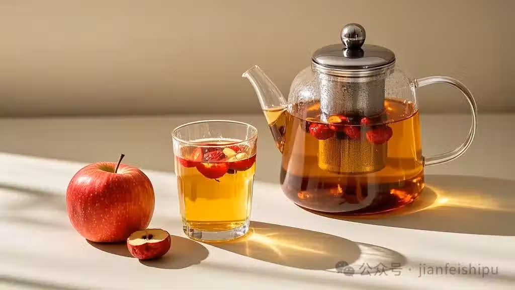 這款茶方適合食欲不振、消化不良的朋友。山楂有助於消食、促進胃腸蠕動,特別適合肉食積滯的人;紅棗補氣養血,幫助提升脾胃的運化功能;蘋果富含膳食纖維,能幫助調理腸胃,促進排便。三者結合,幫助清理腸胃,增加食慾,調節消化系統,從根本上解決體內脂肪堆積問題。