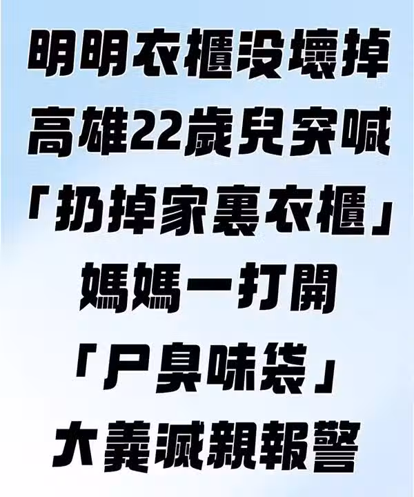高雄22歲兒突喊「扔掉家裡衣櫃」媽媽一打開「屍臭味袋」大義滅親報警
