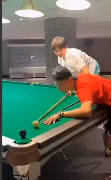 視頻里,她看到撞球桌上只剩下一個球,而且那個球離洞口特別近,她就急著要自己來打。結果呢,她爬上去,姿勢還挺標準,但球卻沒打進洞裡。