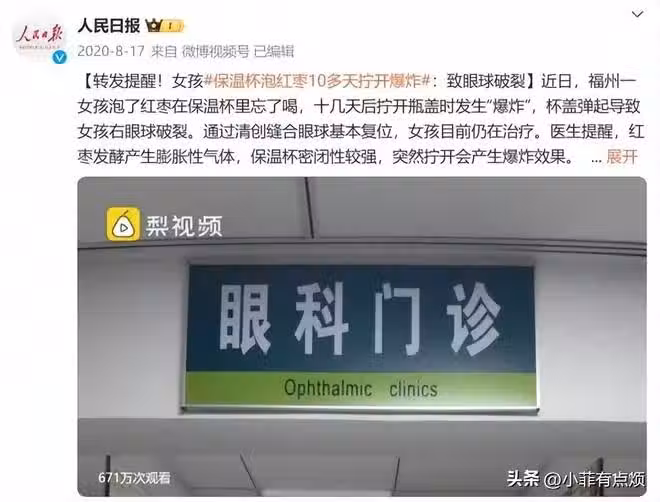 後來不知道為什麼又想起來了這一杯「發酵」的紅棗水,時隔了十來天再次打開,可就在打開的時候保溫杯發生了較為嚴重爆炸,恰好女孩離著保溫杯的距離還是非常的近,最終的結果就是炸傷了這個女孩,導致她的眼球破裂進了醫院。
