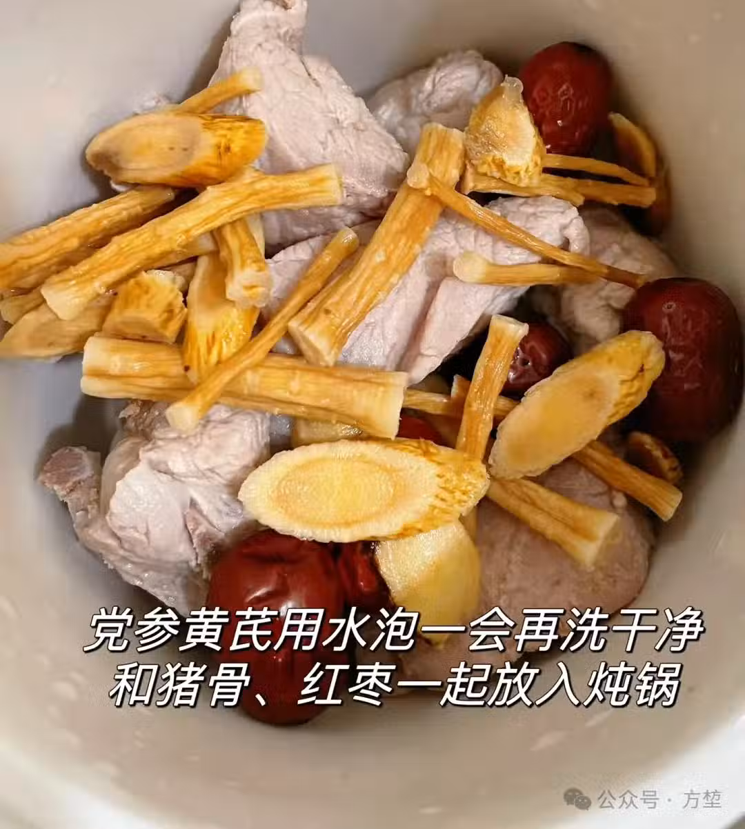 燉煮湯底:將處理好的豬骨放入燉鍋或湯鍋中,加入適量的清水,水量要沒過豬骨,一般高出豬骨2-3厘米左右。加入黃芪、黨參、薑片,大火煮開後轉小火慢燉。小火燉煮1.5-2小時左右,讓豬骨和藥材的營養充分釋放出來。