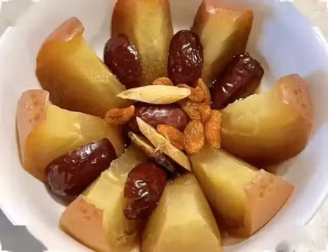 2.將蘋果去核切塊和紅棗、紅糖、黃耆、枸杞一起放入碗里,加入一點點水,上鍋蒸25分鐘即可。