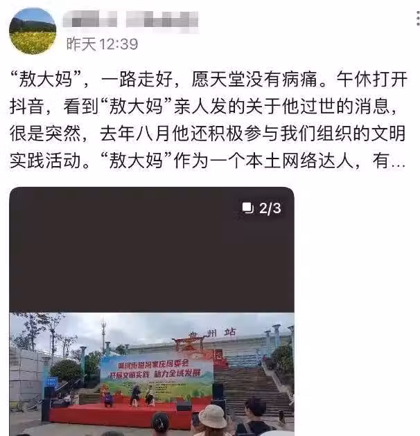 認識敖大媽的網友發文,看到「敖大媽」親人發布關於他過世的消息,對此感到很突然,去年對方還參加文明實踐活動,敖大媽作為一個網絡紅人,有一定影響力,曾為鄉風文明建設等工作做出自己的努力。