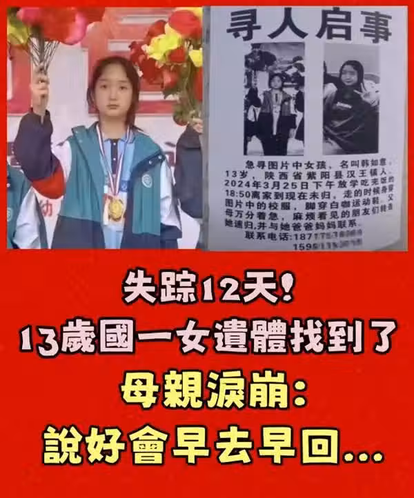 直到韓如意失蹤第12天,韓如意的身影才被找到,可惜已經殞命多時,讓雙親痛不欲生。