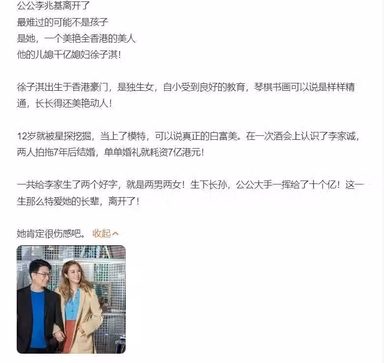 比起家族內鬥,更令徐子淇頭疼的或許是丈夫李家誠的「長情緋聞」。據港媒爆料,李家誠與一名空姐前女友育有一女,雖未被李家承認,但兩人30年來始終藕斷絲連,甚至被曝在日本豪擲千金度假。更戲劇的是,女星周秀娜也被捲入這場豪門糾葛。傳聞李家誠曾與她秘戀並誕下私生子,雖遭否認,但「嫩模逼宮」的輿論持續發酵。