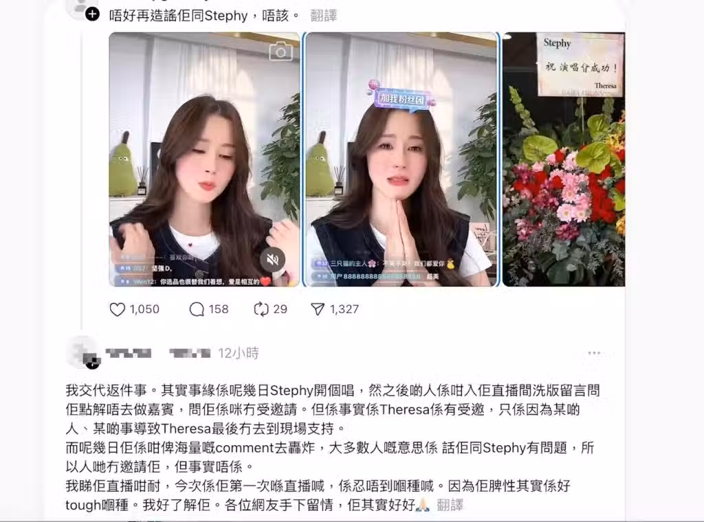事實上今次鄧麗欣開演唱會,傅穎亦有送上花籃支持,但就有網民在社交平台爆料指:「事實是Theresa(傅穎)是有受邀,只是因為某些人、某些事導致Theresa最後沒有去到現場支持。」