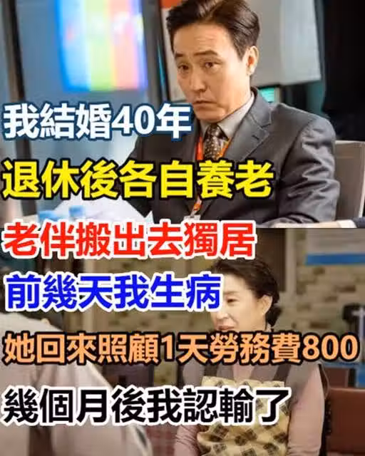 我結婚40年「退休後各自養老」,老伴搬出去獨居,前幾天我生病,她回來照顧「1天勞務費800」,幾個月後我認輸了