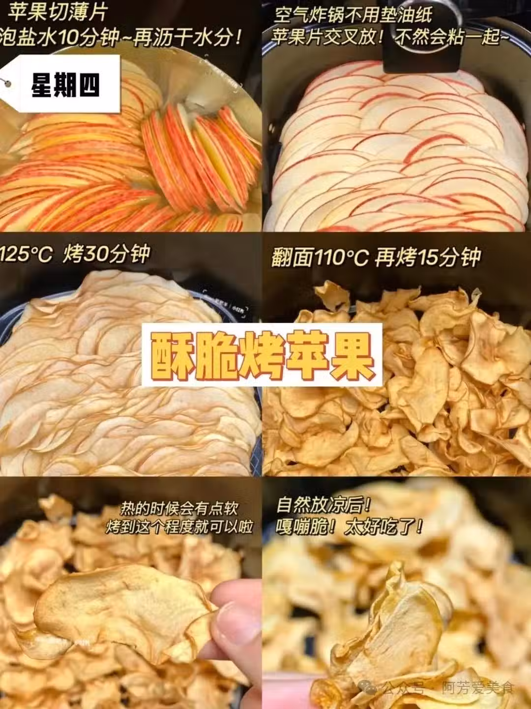 酥脆烤蘋果,這款非常的適合不愛生吃蘋果的寶子們,都可以嘗試一下以上這一款的做法。 切薄片後泡鹽水,再放入空氣炸鍋中,出鍋後記得放涼,一口一片,酥酥脆脆,還有蘋果的清香。