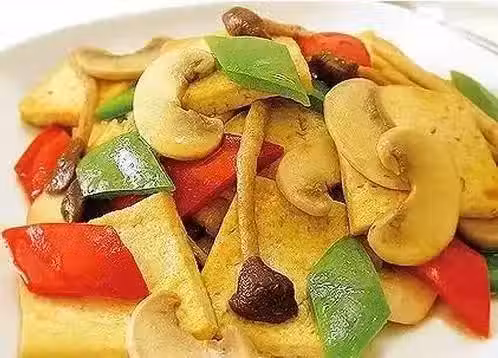 1、豆腐切片;青紅椒切菱形片;口蘑洗凈切片;茶樹菇洗凈備用。