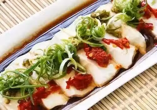 4、關火後,將豆腐盤拿出,去掉保鮮膜,燒中熱油後潑上即可。