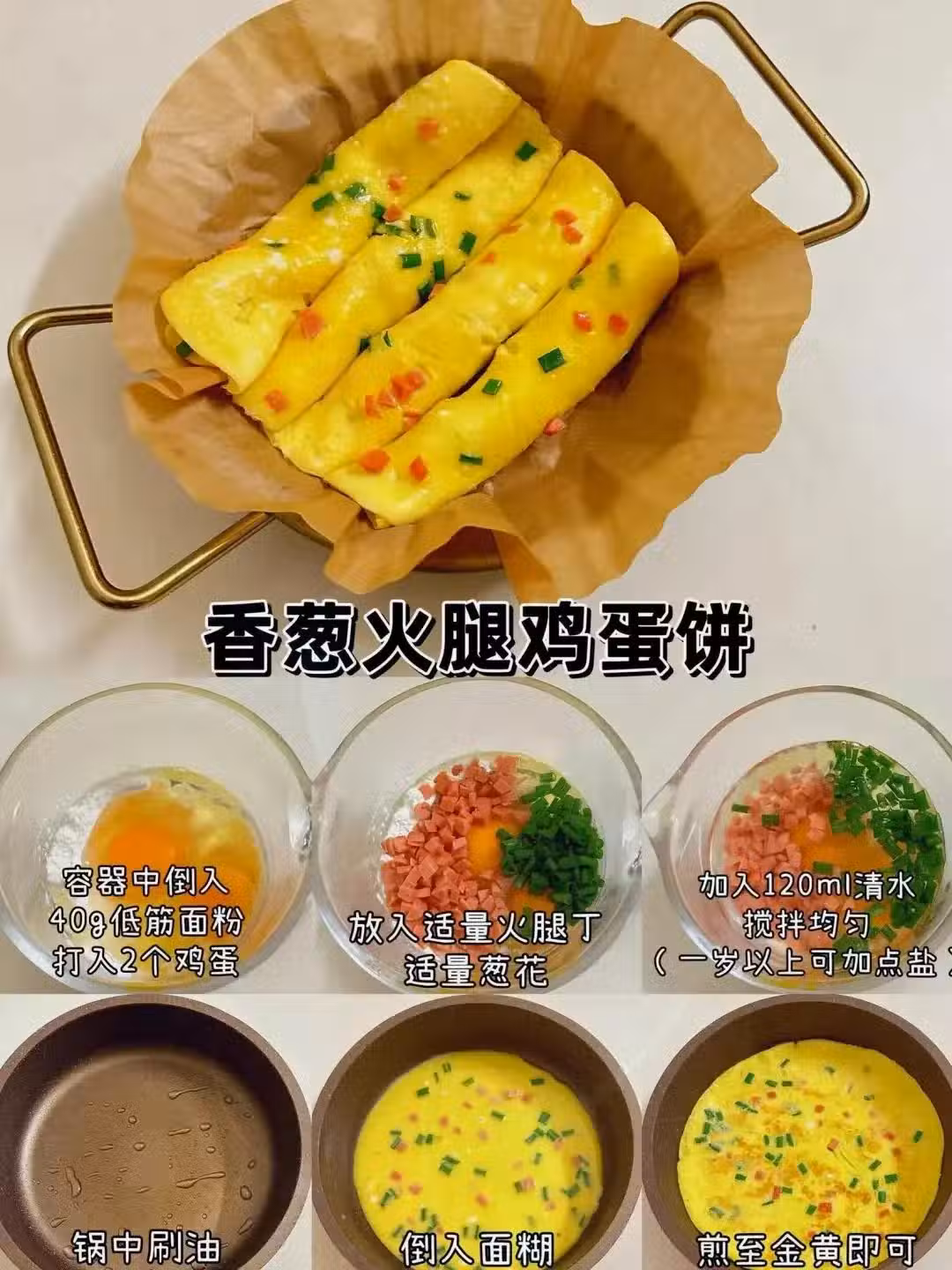 8. 香蔥火腿雞蛋餅:小學生的捧場王 雞蛋+火腿丁+蔥花,攪勻倒進平底鍋,晃一晃攤成圓餅,翻面時請使出「手腕一抖」的絕技(失敗了也沒事,碎了照樣香)。 這款屬於「幼兒園小朋友都能自己啃完」的省心款。 寶寶版醬香餅