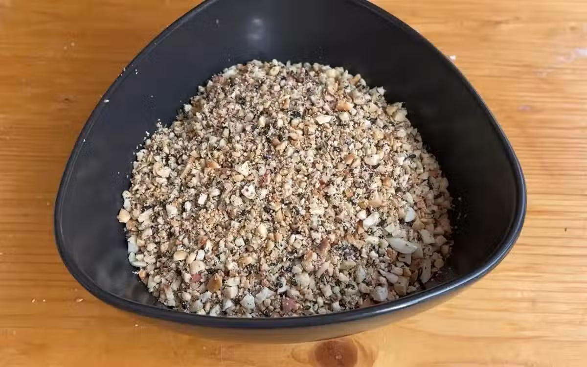 放涼的花生我們輕鬆就去掉花生衣,清理好的花生和黑白芝麻都倒進保鮮袋裡,搟麵杖搟碎,倒入碗里。
