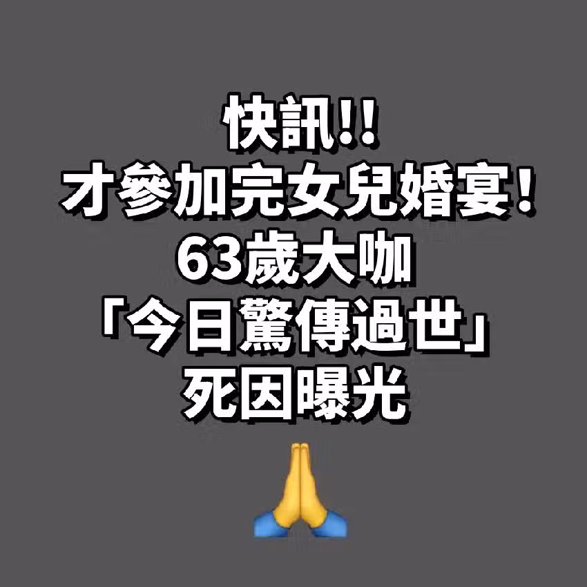 快訊/才參加完女兒婚宴!63歲大咖「今日驚傳過世」死因曝光!